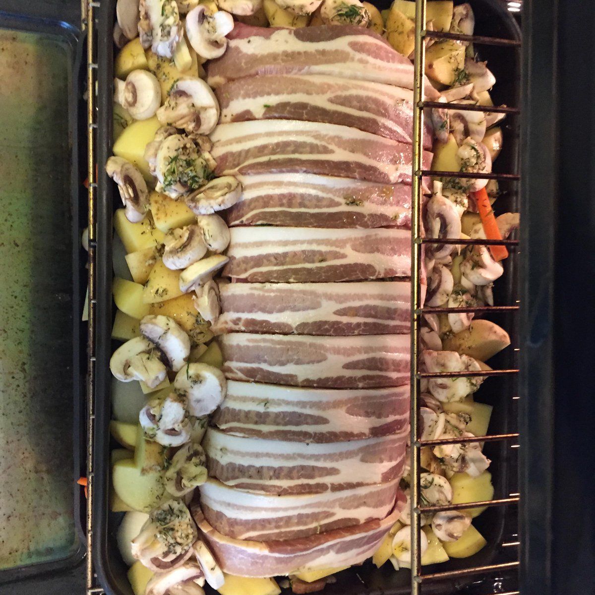 This is dinner. Bacon wrapped pork loin with fresh herbs between the bacon and pork. Proud of it already.